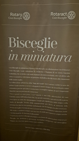 Service dell’Anno Rotariano 2018-2019 con la presidenza di Nadia Di Liddo, “Bisceglie in Miniatura” è un progetto che vuole valorizzare la creatività e l’ingegno di un uomo, Giacinto Galantino, che si dedica con tanto impegno al nostro territorio, oltre ad offrire alla città e a quanti la visiteranno un percorso simbolico, che dia inizio alla conoscenza delle nostre radici.