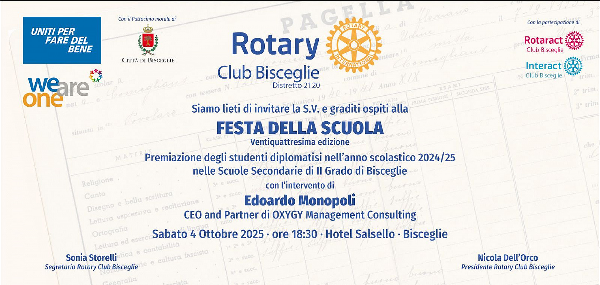 È con grande piacere che Vi invitiamo alla XXIV edizione della Festa della Scuola, organizzata dal nostro Club sabato 4 ottobre alle ore 18:30 presso l'Hotel Salsello.