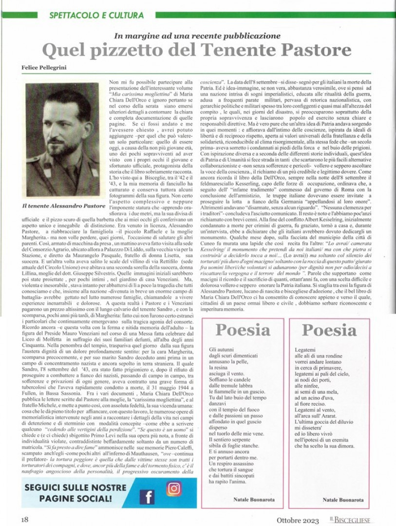 Nella sua presentazione, Giuliano Porcelli fa presente che Maria Chiara Dell’Orco, nel suo libro – che pur essendo il primo, figura, appena dopo 5 mesi dalla stampa, tra i primi dieci più venduti dalla casa editrice- rivive con empatia e commozione la tragica esperienza familiare di Alessandro Pastore, uno dei 50.000 Internati Militari Italiani morti nei campi di concentramento durante la II guerra mondiale, papà del Rotariano Raffaele Pastore che saluta e ringrazia insieme a tutti i familiari presenti quella sera, con particolare riguardo a Mauro Veneziani Santonio sopraggiunto da Cuneo. Il titolo trae spunto dal dialogo epistolare tra il giovane Alessandro e la sua “carissima mogliettina” Margherita: “Mia carissima mogliettina, (…) Come rimpiango il tempo perso lontano dalla famiglia quando avevo la possibilità di restare con voi. Questo, siiene certa, non avverrà più; sbagli simili non ne commetterò mai più (…)”. Il volume presenta un approfondimento degli storici Orlando Materassi e Silvia Pascale.