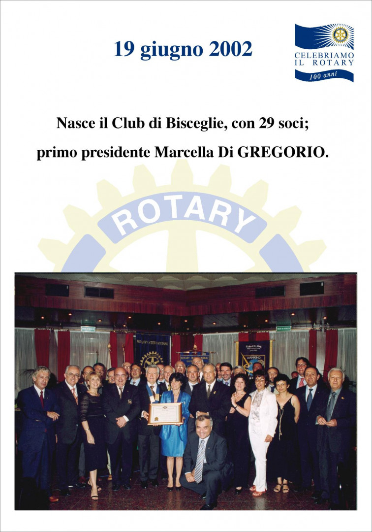 NewsMercoledì 23 Febbraio 2005, alle ore 19,00, presso l'Auditorium di Santa Croce in Bisceglie, nell’ambito delle celebrazioni del centenario della nascita del Rotary International, il Rotary Club di Bisceglie presieduto dal Preside Prof. Giuseppe D'Andrea invita la cittadinanza all'inaugurazione della mostra "Celebriamo il Rotary, 100 anni - 23 Febbraio 1905-23 Febbraio 2005" che resterà aperta tutti i giorni, dalle 18 alle 21, fino al 23/02/2005. Nella serata inaugurale intervengono il Giornalista RAI Costantino FOSCHINI con una sua relazione sul tema: "'900: un secolo da ... dimenticare?" e il Prof. Tommaso BERARDI, Past Governatore del Distretto 2120 Rotary International di Puglia e Basilicata.