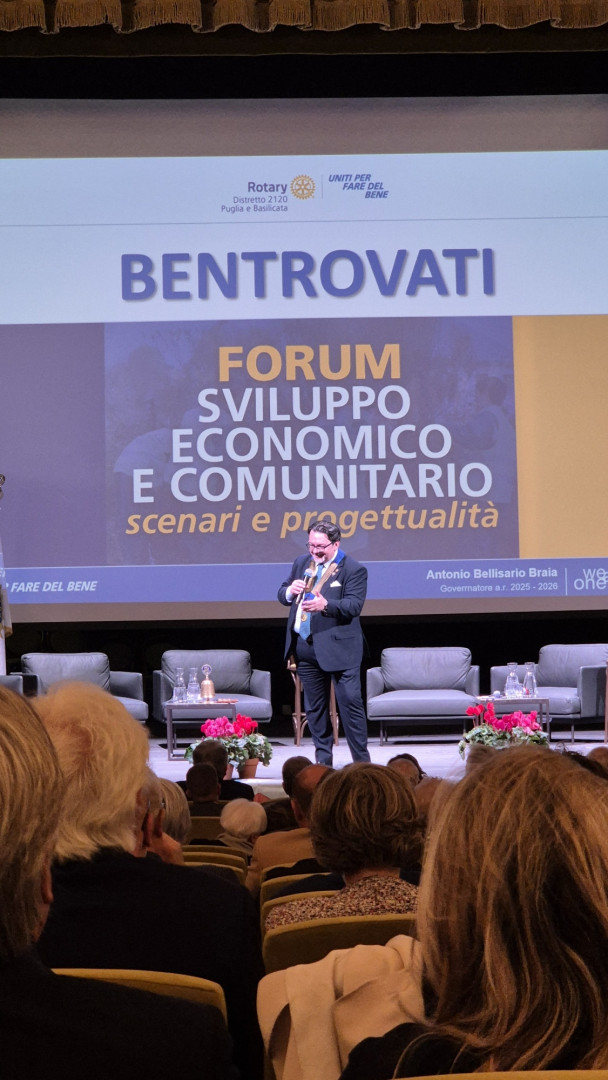 Nel Distretto 2120 con il Governatore Antonio Bellisario Braia abbiamo celebrato questo tema sabato 11 ottobre con un Forum dedicato in uno dei luoghi più suggestivi della città di Bari: il Teatro Kursaal Santalucia. La manifestazione ha avuto il titolo di: “Sviluppo economico e comunitario: scenari e progettualità” (scarica qui il programma); durante la mattinata rotariani, istituzioni e mondo produttivo si sono ritrovati per riflettere, per immaginare e per costruire insieme percorsi di crescita e di benessere condiviso. E' stato un dialogo aperto, dove si sono intrecciate idee e progettualità, generando ed ispirando progetti ed azioni per la creazione di nuove opportunità, per le comunità vicine di Puglia e Basilicata e per quelle lontane, per persone che conosciamo da sempre e per quelli che non conosceremo mai.
