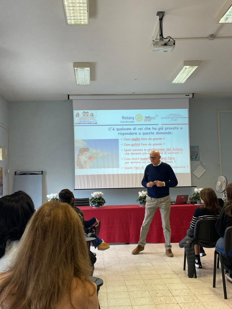 ProgettiIn un contesto sociale ed economico in rapida evoluzione, risulta molto difficile per le nuove generazioni la scelta verso le aree di sviluppo economico professionali più interessanti a medio e lungo termine. Quindi, in un’ottica di affiancamento e supporto sia alla Scuola che alle famiglie, abbiamo attivato il nostro service, oramai pluriennale, denominato “Orientamento 2030”: un progetto che, raccogliendo le disponibilità di alcuni soci del Rotary Club di Bisceglie, presieduto quest'anno da Nico Dell'Orco, si propone di fornire agli studenti di classe III^ ed alle famiglie, le informazioni utili per migliorare la loro capacità di scelta, renderla più consapevole e condivisa, soprattutto rispetto all’indirizzo di studio superiore.